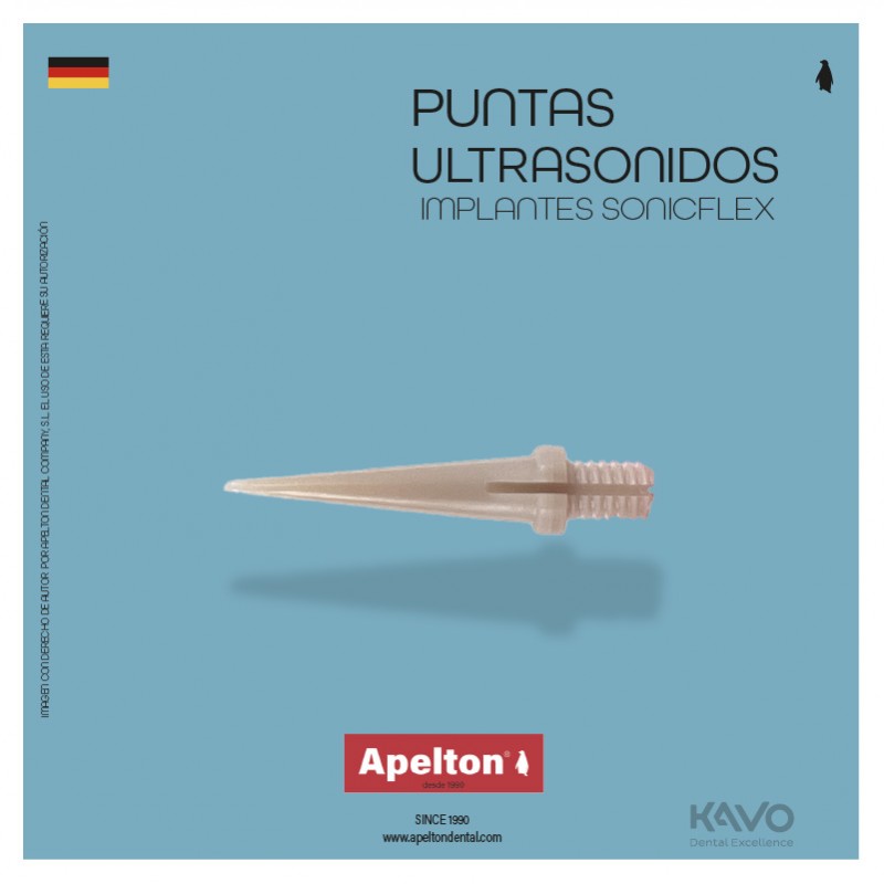 Punta de ultrasonidos sstema SonicFlex implantes de Kavo. La limpieza subgingival las áreas cervicales lisas de los implantes principalmente elaborados de titanio. Por ello se necesitan puntas especiales para pacientes con implantes para realizar una limpieza profesional. Puntas - scaler convencionales de acero templado son duras y pueden lesionar el titanio más blando en la superficie. Esto puede fomentar la regeneración muy rápida de placa.